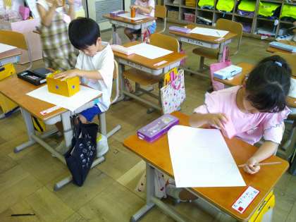 いろいろなかたちの箱を使って絵をかきました。