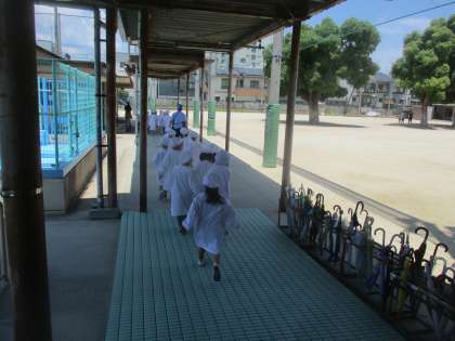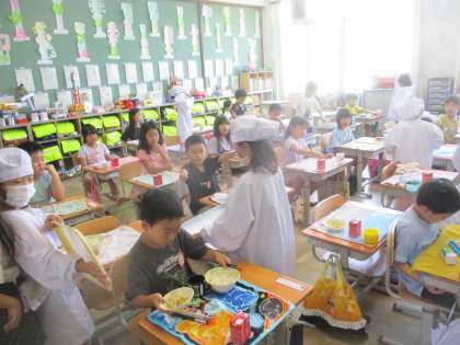 今週に入り,かなり暑くなってきました。衛生面や安全面からも,給食当番さんは長そでのエプロンを着用していますが,この時期は大変です。でも,朝から,もっと暑い調理場で給食を作ってくださっている給食調理員さんに感謝しながら,一生懸命当番をがんばっています。 (1年生も,2か月たって,当番の仕方がすごく上手になりました。)