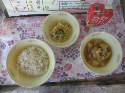 今日の献立は,◆むぎごはん ◆肉じゃが(ピリ辛みそ味) ◆ごま酢煮 ◆牛乳 です。
