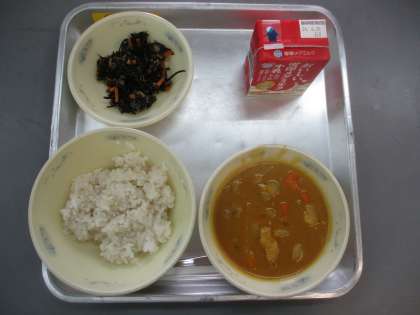 今日の献立は,◆むぎごはん ◆チキンカレー ◆ツナとひじきのソテー ◆牛乳 です。
