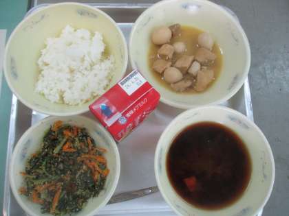 今日の献立は,◆ごはん ◆あかだし ◆鶏肉のさっぱり煮 ◆だいこん葉のごま炒め ◆牛乳 です。
