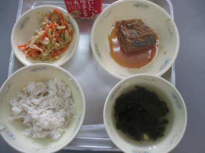 今日の献立は,◆むぎごはん ◆すまし汁 ◆さばのかわり煮 ◆キャベツのごま煮 ◆牛乳 です。