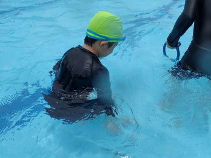 初めての水泳学習をする児童もいたので、丁寧に水慣れをしてから、け伸びの練習やバタ足の練習をしました。