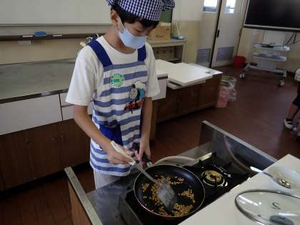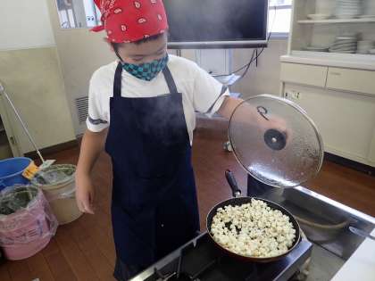1人1台のコンロとフライパンを使い、塩味のポップコーンを作りました。