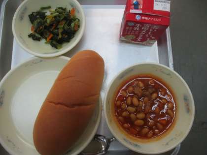 今日の献立は,◆ミルクコッペパン ◆ポークビーンズ ◆小松菜のソテー ◆牛乳 です。