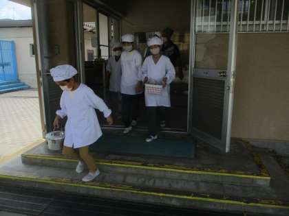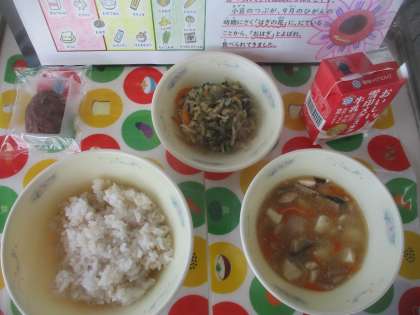 今日の献立は,◆むぎごはん ◆鶏肉と豆腐の葛煮 ◆切り干し大根のごま煮 ◆おはぎ ◆牛乳 です。