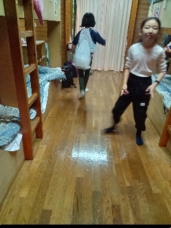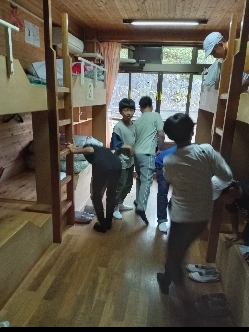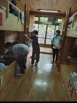 宿泊棟に入ります。自分たちの部屋を確認して荷物整理をしたり寝具の準備をしたりします。