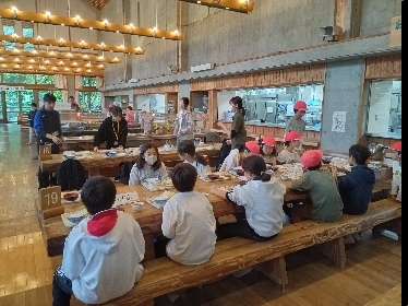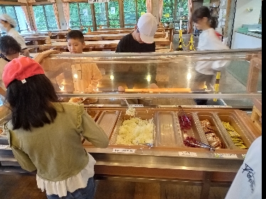 ミートボール ポテトフライ ちくわの煮物 切り干し大根の煮物 キャベツの千切り ふりかけやジャム マーガリン ドレッシングも各種あります。今日の活動に備えてしっかり食べましょう!