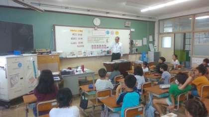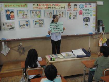 下京詩警察署のスクールサポーターの方をお招きして非行防止教室をしました。「やっていいことと悪いことを理解し、いつも正しい行動ができるようにしよう」をめあてに学習しました。迷ったときはいったん止まって正しいことかどうか考えることが大切だと学びました。