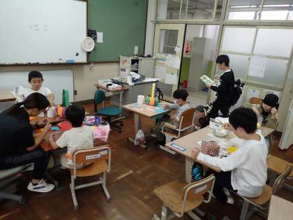 牛乳パックでかぼちゃのかばんを作ったり、花紙とティッシュペーパーをねじってお菓子に見立てた作品を仕上げたりしています。