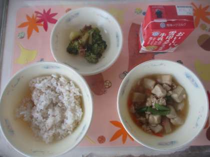 今日は,一気に気温が下がり,肌寒い一日となりました。あたたかい給食がとってもありがたいですね。出汁がしみこんだやさしい味付けであたたかい高野豆腐が心の中まであたためてくれるようです。