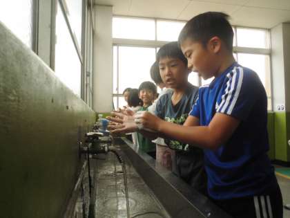 ウイルスを体に入れないためにも、石鹸を使った正しい手の洗い方を学習し、実際に手を洗いました。