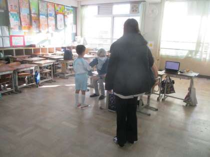 初めて学校に来た子どもたちも多く,広い体育館やたくさんある教室に興味津々。