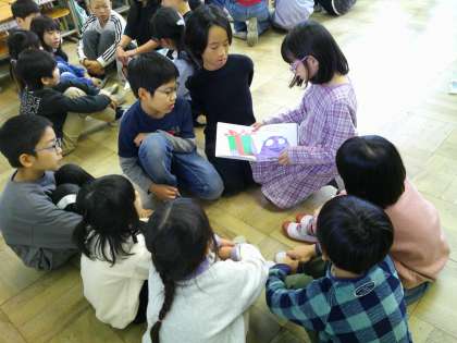 3年生が1年生のために読聞かせに来てくれました。1年生に伝わるように丁寧に読む3年生の優しさにふれて1年生も自然と笑顔があふれていました。
