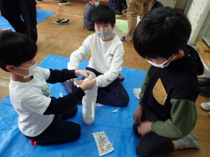 今日は小さな巨匠展に向けて、七条中学校ブロックの3校の小学校で集まって合同制作を行いました。