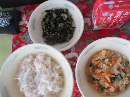 今日の献立は、◆麦ごはん ◆小松菜とひじきの炒め物 ◆揚げたま煮 ◆牛乳 です。