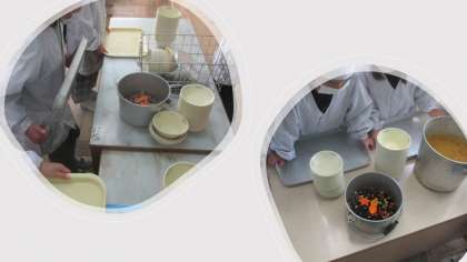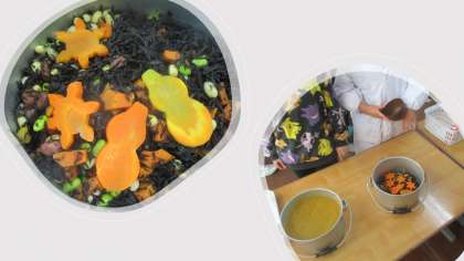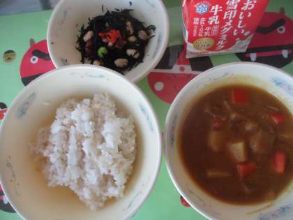 今日の給食は、◆玄米ごはん、◆チキンカレー、◆ひじきのソテー、◆牛乳 です。