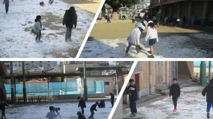 やってきた子どもたちは,以外にも残っていた雪に大はしゃぎ。固まった雪をガリガリとこすったり滑りやすいところを見つけてつるつると滑り出したり,休み明けの思わぬプレゼントに,みんな大喜びです!
