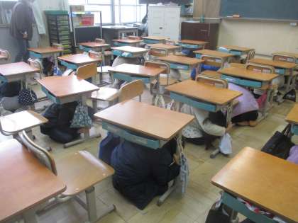 東日本大地震が発生した3月11日。本校でも,京都市シェイクアウト訓練を行いました。