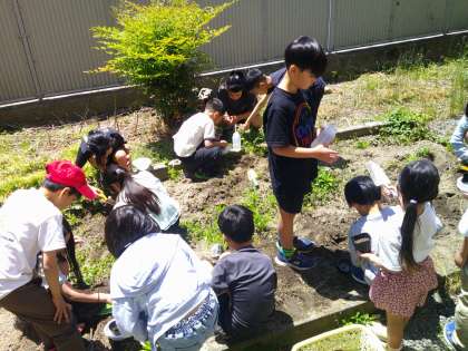 先週、ひょうたんの種植えをしました。グループごとに育て方を調べ、よりよく育てるためにはどの場所で育てたらよいのかを話し合い、おもいおもいの場所で育てています。まだ、芽は出ていませんが、これからが楽しみです。