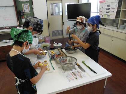 初めての調理実習では、「ゆでいも」と「ほうれん草のおひたし」を作りました。