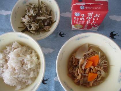 今日の献立は、 ◆むぎごはん ◆あぶらあげのチャンプル ◆クーブイリチー ◆牛乳