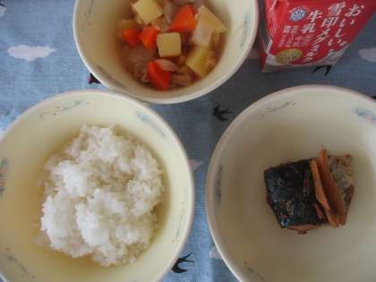 今日の献立は、 ◆ごはん ◆鶏肉と野菜の煮付け ◆さばのしょうが煮 ◆牛乳です。