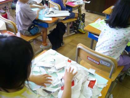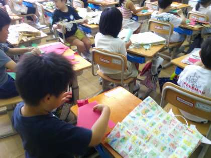 1年生の図画工作の授業では、包装紙や紙袋をやぶいて何に見えるか考える活動を行いました。