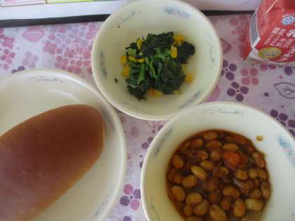 今日の献立は、◆黒糖コッペパン ◆チリコンカーン ◆ほうれん草のソテー ◆牛乳 です。