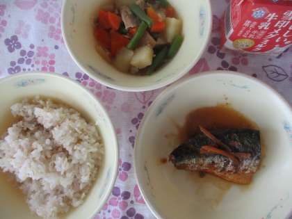 今日の献立は、◆麦ごはん ◆さばのかわり煮 ◆豚肉と野菜の煮つけ ◆牛乳 です。