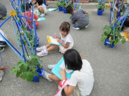 花が咲いていることに喜んだり、「つぼみ」で学習したことを思い出して驚いたりしていました。