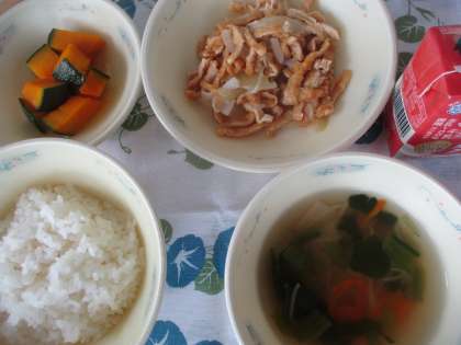 今日の献立は、◆ごはん ◆たなばたそうめん ◆きつねうどんぶりのぐ ◆かぼちゃのにつけ ◆牛乳 です。