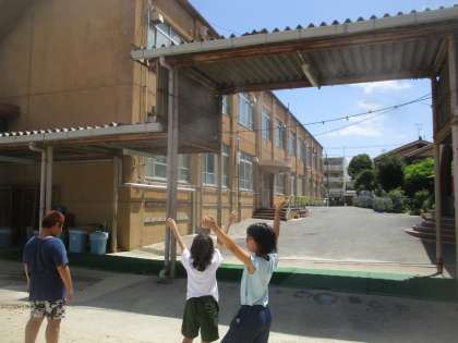 さあ、蛇口をひねると、霧状の水が渡り廊下を覆いました。風が吹くと。その帯は、右に左に動き、上下に広がります。その霧を追って子どもたちも右往左往しながら歓声をあげています!