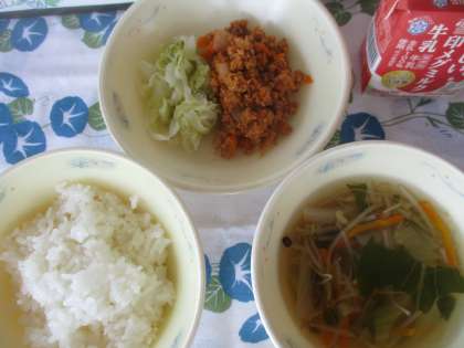 今日の献立は、◆ごはん ◆タコライスふうのぐ(ソテー)(タコミート) ◆スープ ◆牛乳 です。