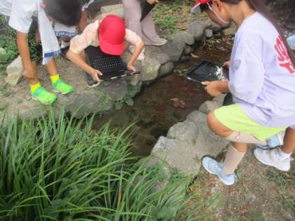 今日は、2年生が植物や水辺の様子を観察しながらiPadを使って記録をしていました。