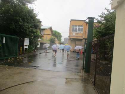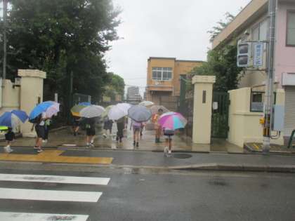 台風が近づいている影響もあり、朝から雨模様です。その雨を吹き飛ばすかのような、子どもたちの元気なあいさつ。「おはようございます!」の声が心地よく響きます。