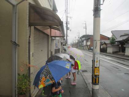 新しい傘にご機嫌の子もいれば、狭い御前通を危なっかしく通っていく子も。雨の日ならではの楽しさと危うさが入り混じった光景です。