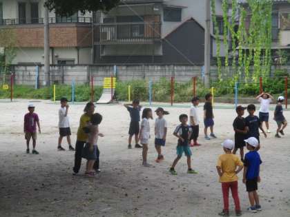 雨上がりの蒸し暑さの中でも、元気に笑顔で遊ぶ子どもたち。鬼ごっこにボール遊び、思い思いの時間を楽しんでいました。