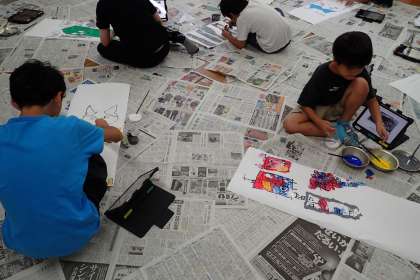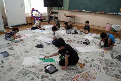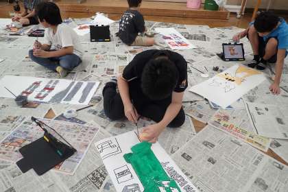 それぞれの児童が、自分が使う道具の絵柄に絵の具で色づけています。