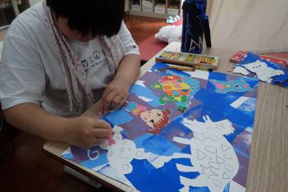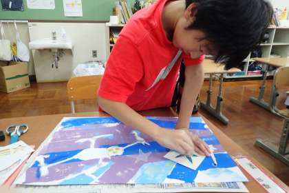 ローラーで色付けた後には、星やハートなどをかたどったものの上からコンテで色を塗りました。