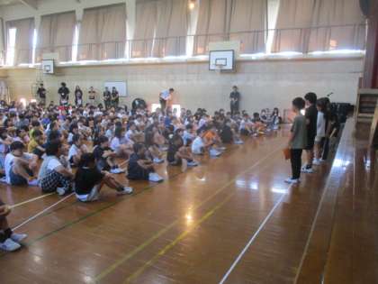 まずは、1学期に頑張って取り組んだ書写や絵画作品の表彰です。校長先生から一人ひとりに賞状が手渡されると、体育館いっぱいに大きな拍手が響きました。友だちをたたえる声も聞こえてきました。