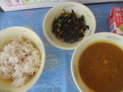 今日の献立は、◆麦ごはん ◆チキンカレー ◆ひじきのソテー ◆牛乳 です。