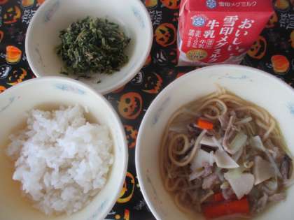今日の献立は、◆ごはん ◆ちゃんぽん ◆大根葉のごま炒め ◆牛乳 です。