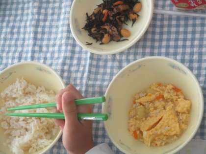 今日の献立は、◆玄米ごはん ◆ふっくらだし卵 ◆ひじき豆 ◆牛乳 です。