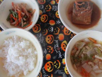 今日の献立は、◆ごはん ◆さばの味噌煮 ◆野菜のきんぴら ◆白菜の吉野汁 ◆牛乳 です。
