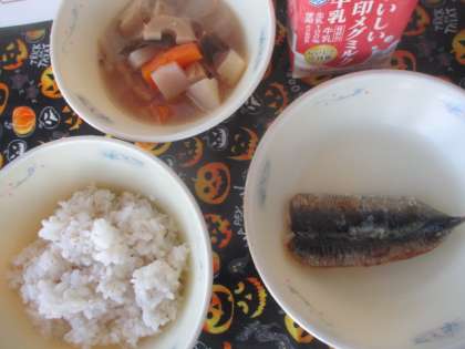 今日の献立は、◆むぎごはん ◆開きいわしの塩こうじ焼き ◆関東煮(だし昆布入り) ◆牛乳 です。