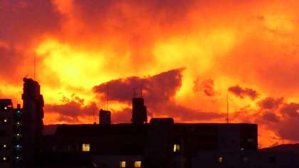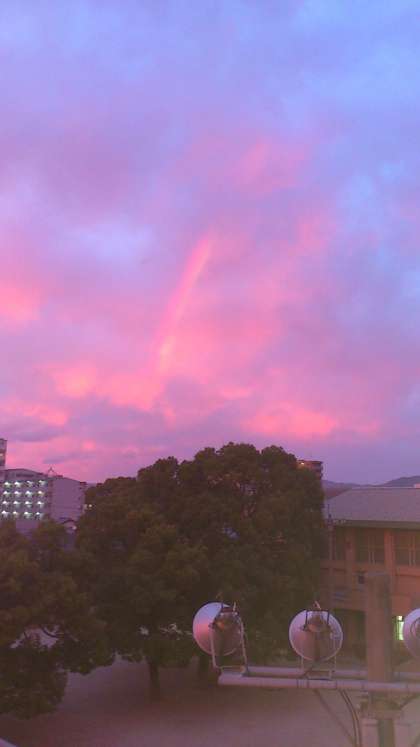5年生は今日から長期宿泊学習に行きました。シトシトと雨模様だったのですが,夕方は写真のようなステキな夕焼け。そして,くすのきに降りてくるかのような虹が。