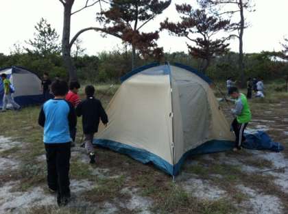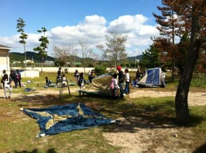 11時頃に「縄跳び大会」が終わったので,テント設営をしました。子どもたちに「今日は,テント泊です!」と伝えると,大喜びでした。
