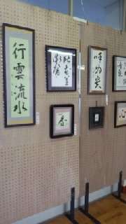 図書室では「切り絵・張り絵」と「フラワーアレンジメント」の展示,プレ−ルームでは習字,というより書の作品展示,ふれあいサロンではお茶席が用意されています。