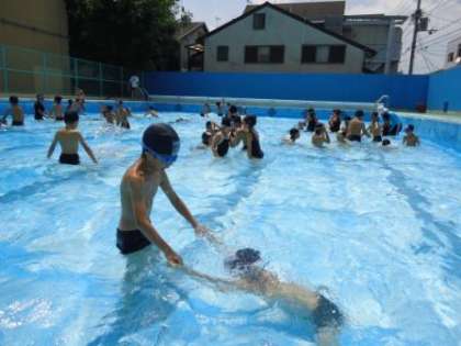 体育科では,「水遊び」の学習をしています。子どもたちは,水中じゃんけん・電車ごっこ・地下鉄ごっこなどの遊びに加え,だるま浮き・ふしうき・けのび・バタ足などの練習も行い,楽しみながら水に慣れる学習を行っています。水泳学習は,あと少しとなりましたが,子どもたちが安全に楽しく学習に取り組むことが出来るように,見守っていきたいと思います。
